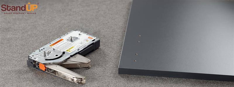 Chỉ cần đặt loại cơ cấu nâng này sao cho chạm vào khung trên cùng và bằng với bề mặt tủ, sau đó bắt ốc vít vào. Không cần khoan trước.